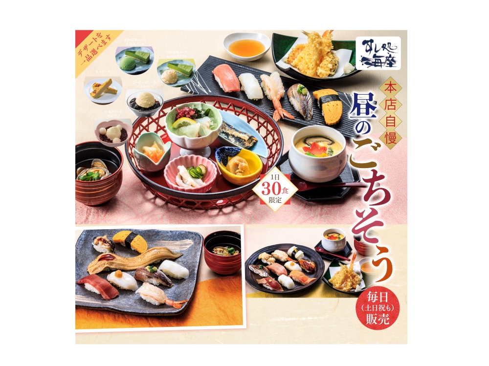 また人気の「昼すし」はリーズナブルな価格で海座のお寿司を堪能できます。人気の寿司ネタ8貫に、天ぷら・茶碗蒸し・うどんなどからお好みの2品が選べ、さらにみそ汁がお替り自由なのが人気の秘密です。
