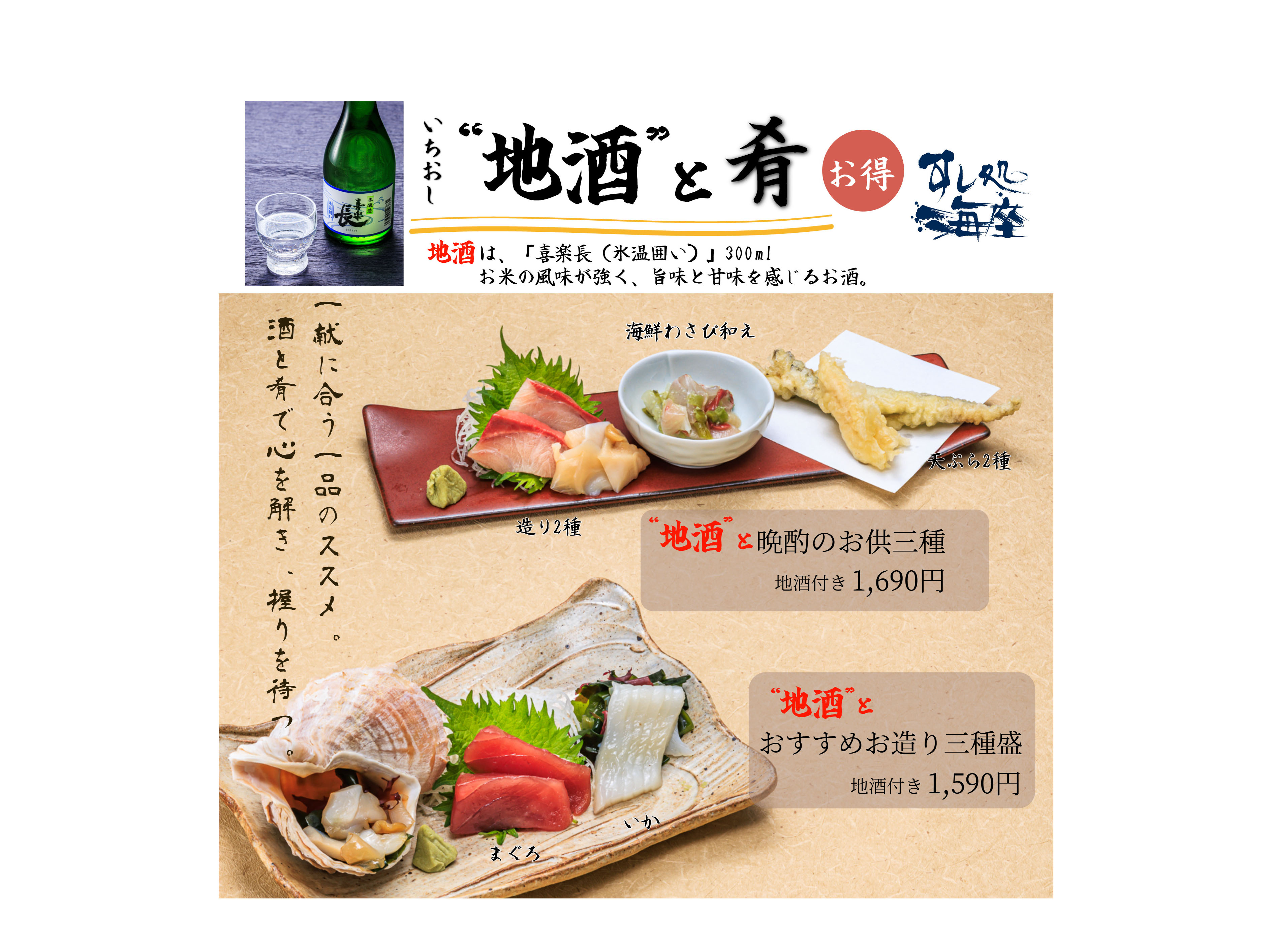 すし処海座では日本海の幸をはじめ、全国各地から旬の素材や鮮度が良い素材を、職人が一つひとつ丁寧に作ったお寿司やお料理をご提供します。