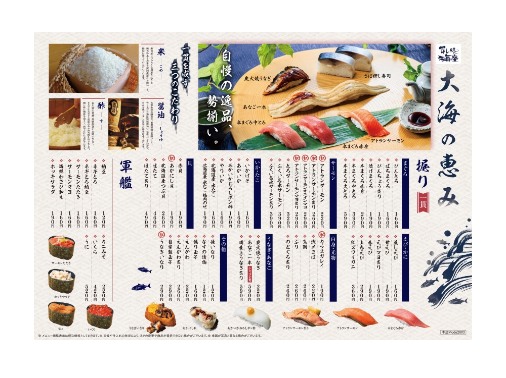 すし処海座本店(大藪店)では、米、ネタ、寿司酢、寿司醤油、赤地卵など、美味しさにこだわった厳選素材を使用しております。